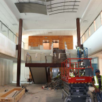 Back inside, interior glass walls and sliders were installed [bottom row, left]. The glass allows for phone-call privacy while enabling the light to come through to the interior spaces. It accentuates the openness of the building and invites you to come in. The view of the EMF/Wiegenstein conference room, in the center of the third floor [bottom row, center]. The Wiegenstein Legacy Society display will cover much of the west wall that we see on the right hand of the photo. The ACEP headquarters’ exterior, [bottom row, right], looks just as inviting as its interior design.