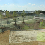 The view outside the second floor break room, looking west, [top row, right]. It’s a bit hard to see, but at the bottom of the frame you can see sod. The red oak trees lining the walking path will eventually lend us some shade in the afternoon sun.