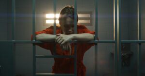 Female prisoner in orange uniform in jail cell