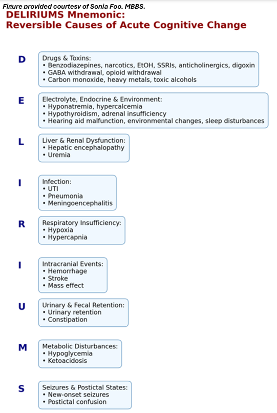 By contrast, encephalopathy is a pathobiological process, referring to diffuse brain dysfunction caused by metabolic, toxic, infectious, or other systemic disturbances.1 Encephalopathy has a broad pathogenesis, and delirium is what the culmination of that pathogenesis might look like clinically. Recognizing this distinction isn’t purely academic — it’s actionable. Once we name it delirium (not just confusion), we can screen for it, work it up, and treat it.