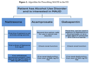 While naltrexone is the best option for AUD due to its safety profile, ease of use, and proven effectiveness, if patients are actively taking opioids, then the next best option would be acamprosate. While its large pill burden (six pills daily) makes it difficult to tolerate, systematic reviews have noted that it does significantly reduce heavy drinking.24 In patients who understand the potential adherence challenges, acamprosate is a suitable alternative to naltrexone. Disulfiram is less likely to be initiated in the ED and has yielded inconsistent data, with some studies demonstrating no benefit and others showing a benefit only when used in a supervised program.24,25,27 Gabapentin is occasionally used off-label for the treatment of AUD, and while there are limited studies demonstrating its effectiveness, it is thought to work well in individuals whose alcohol use is triggered specifically by their withdrawal symptoms.12 Yet, gabapentin has been misused throughout the country and has potentially been linked to numerous overdose-related deaths.12,22