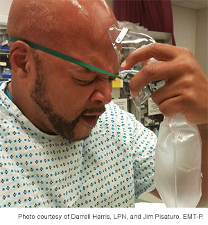 Figure 2. Think about minute ventilation and oxygenation when patients are intolerant of a non-rebreather. The patients are telling you the flow rate through the mask is not meeting their minute ventilation, and they do not want to re-breathe their CO2. Adding nasal cannula (under the face mask) when treating hypoxemia (and preoxygenating prior to intubation) boosts flow rate, washes out CO2, and significantly increases the effective FiO2.