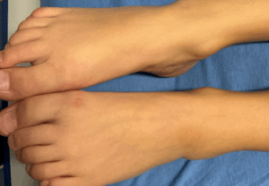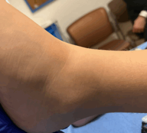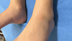 A 10-year-old boy with a history of type 1 diabetes mellitus presented to the emergency department (ED) with fevers for five days. Symptoms began with temperatures as high as 104⁰F with ketones in the urine noted on a home test. The patient did not have any associated symptoms. His mom stated that he had a limp that began after a dance rehearsal a few days ago, though no trauma was reported, and had since improved. The patient’s vaccination record was up to date. On exam, the patient was noted to have a slightly red, minimally tender, flat lesion of the left ankle which was not warm to touch (Image 1). His gait was normal. He had a fever but otherwise the rest of the vital signs were normal. Laboratory tests and an X-ray of the ankle were obtained. Results included: WBC of 6.4 x 103 /µL, CRP of 2.5 mg/L (ref <4.90 mg/L), and procalcitonin of 2.24 ng/mL (ref 0.00-0.50 ng/mL). The chemistry panel was normal with blood glucose 81 mg/dL and no evidence of metabolic acidosis. The ankle X-ray showed soft tissue swelling without acute osseous abnormality. Blood cultures were sent. The patient was presumed to have cellulitis given skin discoloration and swelling on X-ray. He was given ceftriaxone in the ED but developed a rash,and was discharged on doxycycline.