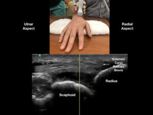 Figure 4: With the ultrasound probe covering the extensor carpi radials brevis, enter the swollen joint capsule with an out-of-plane technique. We recommend a steep needle angle of entry between Lister’s tubercle and the extensor carpi radials brevis. The procedure should be performed with sterile precautions (like any other joint aspiration).