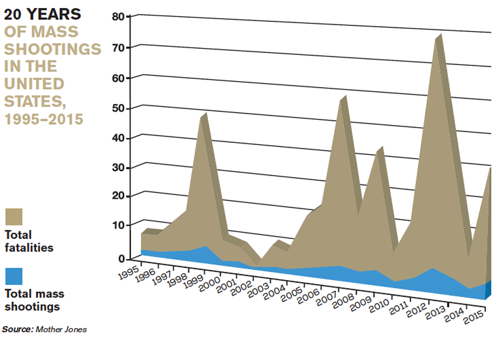 For this chart, a mass shooting is defined as an attack in a public place with four or more people killed. Mass murders in private homes related to domestic violence and shootings tied to gang or other criminal activity are excluded.