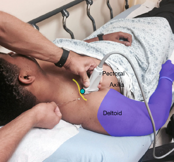 No Responses to “Figure 2: Stand above the patient with the ultrasound screen in clear view. Note the transducer is located in the deltopectoral groove with the needle entering above the clavicle.”