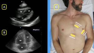 FIGURE 1: A) Subxiphoid view demonstrating a pericardial effusion with signs of echocardiographic tamponade B) Apical four-chamber (A4C) view demonstrating right ventricular strain in a patient with a massive pulmonary embolism C) Three views of the heart when attempting to find a good window to image during cardiac compressions. (Click to enlarge.)