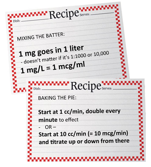 a lecture by Peter Viccellio, MD, FACEP, clinical professor and vice chair of emergency medicine at Stony Brook School of Medicine (who makes a cameo in the images), with the simple title “Epi drips for dummies.” The first image is the recipe for making a 1 mcg/mL epinephrine drip, and the second gives two titration schemes. I’ve already used these images during my shifts.