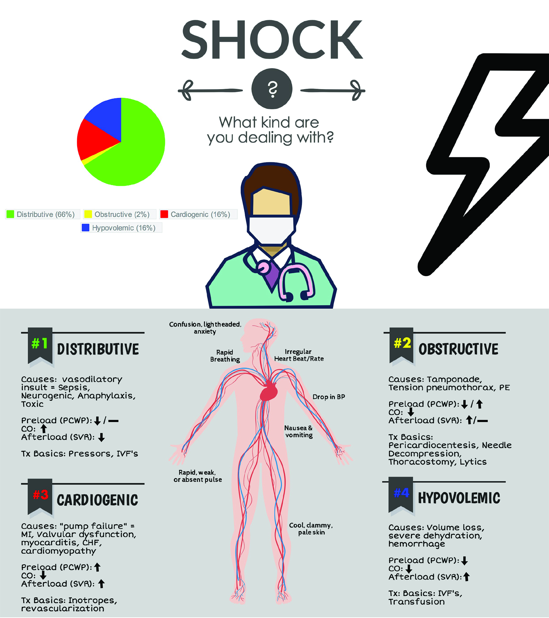 ACEP Now: Vol 34 – No 05 – May 2015@EMinfographics posted this image on shock (see Figure 1). On one slide, they’ve packed in important distinguishing features of the four major types of shock we have to rapidly diagnose and treat. It’s a great image for teaching, and it’s even a good reminder to the seasoned vet.