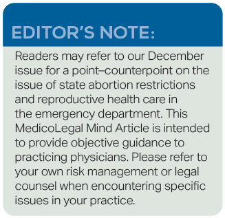 New state laws aim to reduce elective abortions and exempt treatment of ectopic pregnancies, spontaneous miscarriages, fetal demise, and fetal nonviability from prosecution. They do not, or should not, affect care in the emergency department. Current literature suggests criminal and civil actions against emergency clinicians under these strict laws remains low.3,4 However, there have been multiple lawsuits claiming that emergency care was not given because of these new laws or misunderstandings of the laws by clinicians.3,4 Thus, legal problems are more likely to arise from not providing routine emergency care than from altering the standard of care out of fear of prosecution.5