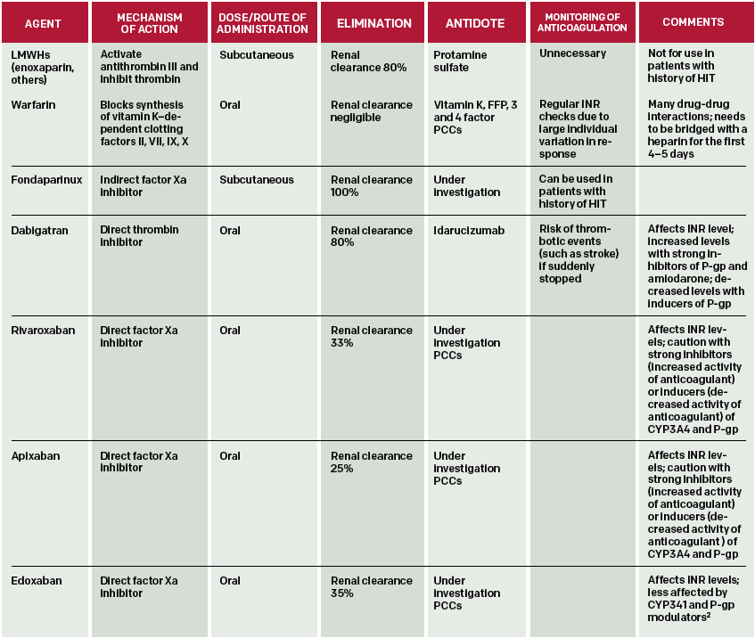 After the diagnosis is established, it should be decided if the patient is appropriate for outpatient management. Those with iliofemoral clot, unstable clot visualized on ultrasound, severe comorbid conditions, or unstable social situations make poor candidates for discharge from the emergency department. There is a paucity of data on outpatient management of upper-extremity DVT. Special attention should be paid to the patient’s risk of bleeding once anticoagulated. In addition to the physician’s judgment, there are tools such as the Registry of Patients with Venous Thromboembolism (RIETE) score (available at www.mdcalc.com/riete-score-risk-hemorrhage-pulmonary-embolism-treatment) for assistance in determining suitability for outpatient management. Patients judged to be a higher risk should be given an easily reversible agent and monitored in the hospital initially.