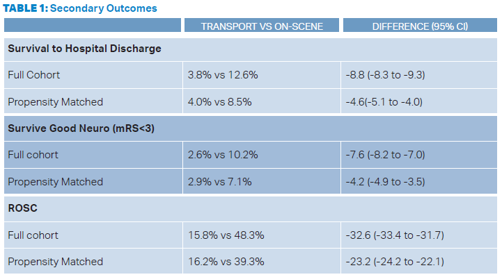 - Primary Outcome: Survival to hospital discharge 12.6 percent on-scene vs 3.8 percent with transport.