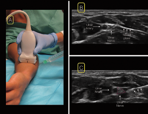 No Responses to “Figure 5. For the ulnar nerve block, position the linear ultrasound at the wrist over the ulnar artery (A). Scan proximally until the nerve separates from the artery in the ulnar direction in the mid-to-proximal forearm (B). insert your needle from the ulnar (medial) aspect of the probe (A&C).”