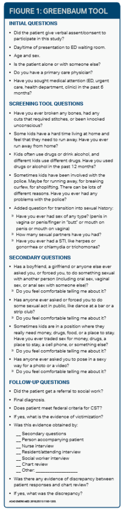 Rapid Appraisal for Trafficking (RAFT) tool (see Figure 2) was validated in 2021 for use in the adult ED patient population and is a comprehensive trafficking screening tool for use in health care settings.15 These screening questionnaires should be readily available to ED staff—either at the nurses’ station or embedded in the electronic medical record—or should be memorized and rehearsed for faster recall.