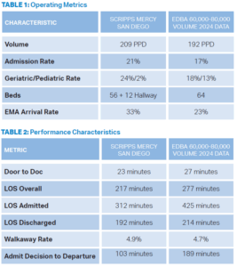 ACEP Now: July 2025Other operating characteristics for this department are seen in Table 1. Interestingly, the geriatric rate is higher than the average for similar departments, and the pediatric rate is lower—both suggesting a higher acuity patient mix—yet the admission rate is only 21 percent. The EMS arrival rate is quite high and this is challenging from an operational standpoint. They have a high behavioral health (BH) population but only modest boarding.