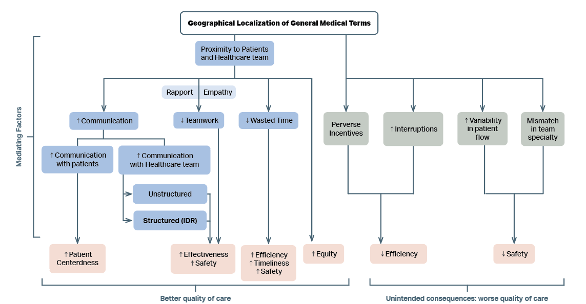 FIGURE 1: Conceptual model depicting impact of geographical localization of general medical teams on quality of care. Mediating factors that lead to better quality of care are described in blue boxes. Mediating factors that are unintended and lead to worsening quality of care are described in grey boxes. The impact on domains of quality of care is described in pink boxes. ‘↑’ indicates an increase; ‘↓’ indicates a decrease; IDR = Interdisciplinary Rounds.