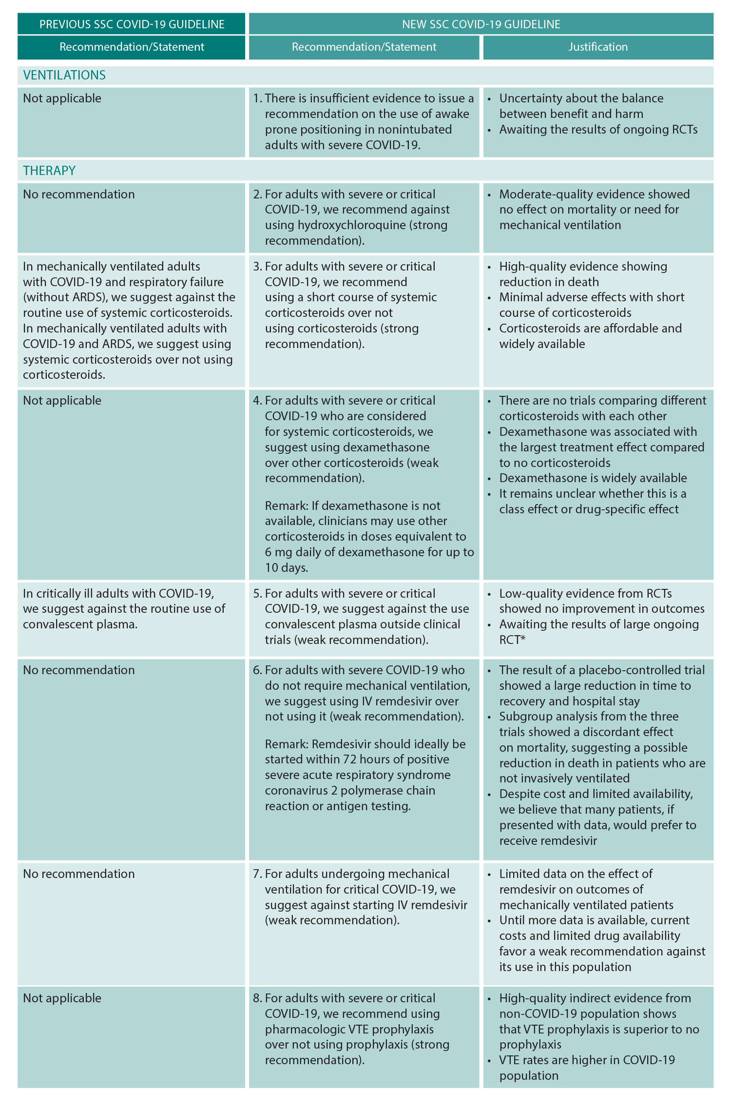 The guideline utilizes “we recommend” for strong recommendations and “we suggest” for weak recommendations. Ultimately three new recommendations and six updated recommendations were added to the prior SSC COVID-19 guidelines. New and updated recommendations will be forthcoming as the COVID-19 evidence base grows in accordance with the above stated living guideline methodology.