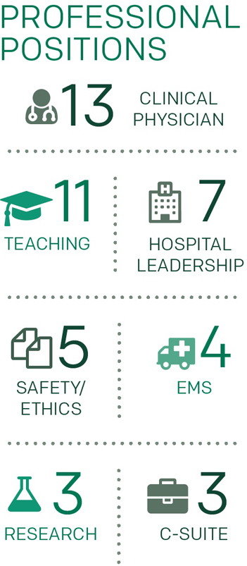 In addition to being attending physicians, there are seven Board members who hold academic physician positions. Some are emergency department directors or EMS directors. Others hold various emergency medicine administration positions in addition to their practice.