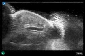 Figure 1: Soft tissue point-of-care ultrasound showing fluid surrounding the flexor sheath at the left middle finger (A) and right thumb (B and C).
