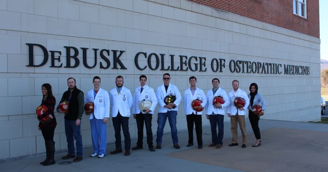 Trained and ready for action, the CGVFD medical student firefighters were called to duty during finals week on Wednesday, Dec. 9, 2015. Tones drop, “Cumberland Gap Volunteer Fire Department, have a report of a house fire, fully involved, unknown if anyone is inside, time now 23:41.” Every member heard the call and, despite being tired from the constant studying and testing over the past few days, responded without hesitation. Fire Chief Brandon Wilkinson (osteopathic medical student [OMS] year II) first responded to the fire station and then onto the fire in Engine 81, with firefighter Wayne Cox (OMSIII) shortly after in Tanker 82. “Both apparatus en route, all firefighters respond straight to scene,” Wilkinson advised on the radio. With smoke visible a mile away, Wilkinson arrived on scene to Ken Todd (OMSIII), Chris Moore (OMSIII), Patrick Herling (OMSII), and Andrew Smith (OMSI) dressed in turnouts. They were standing outside a large two-story home with fire rolling through its kitchen and living room and out the exterior wall and making a run for the rest of the house. “We have to get in there quick, or else the whole thing is gonna go,” Todd said as he grabbed a self-contained breathing apparatus off the truck and started walking toward the house.